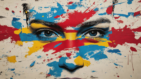 Artistic portrait of a woman with blue eyes blending with colorful paint splatters