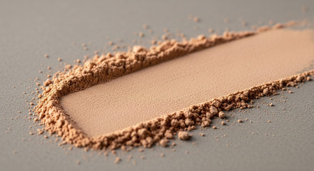A close-up of a beige powder makeup foundation swatch streaked across a gray surface.