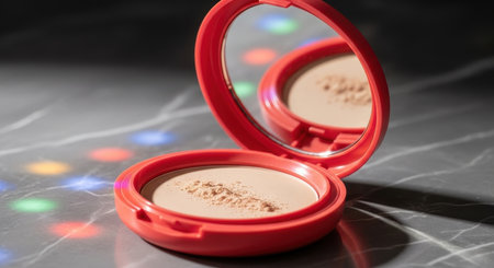 Open coral red compact powder case with beige makeup powder and mirror on a dark marble surface, illuminated by colorful light reflections. Beauty product.