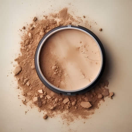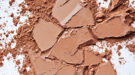 A close-up view of crushed brown powder makeup, partially spilling from a black compact case, showcasing the texture and pigmentation in a stylish aesthetic.