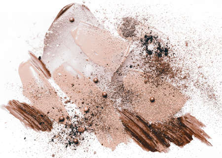 Beauty concept in beige colors. Smudged makeup foundation, broken shadows, smeared lipstick and sparkles on white background