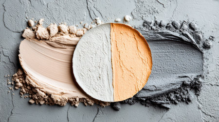 The image displays cosmetic textures and makeup samples. Various shades, including beige, white, orange, and gray, are presented. The composition features a circular element with split colors, and swatches are arranged on a textured backdrop. Ideal for beauty product promotion and related editorial content.