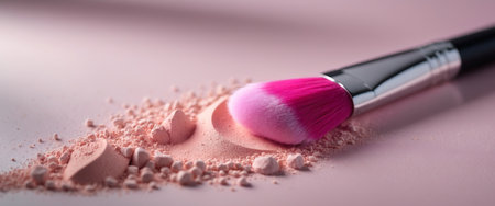 AI Generated. Makeup brush with pink bristles surrounded by loose powder on a pastel pink background