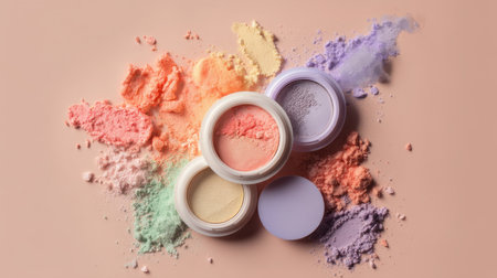 An artistic arrangement of colorful cosmetic powders and loose pigments on a soft pink surface, perfect for makeup lovers and beauty enthusiasts looking to explore vibrant tones.