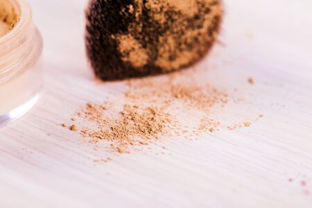 Makeup brushes and powder on a white background. Selective focus.fashion