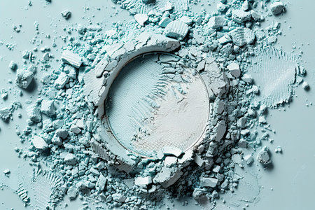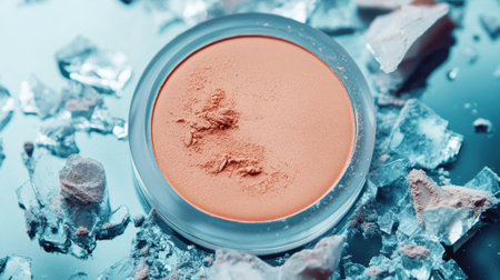 A round container of vibrant makeup powder rests on shattered glass, creating an elegant aesthetic. The soft blue background enhances the beauty and trendy appeal for fashion photography.