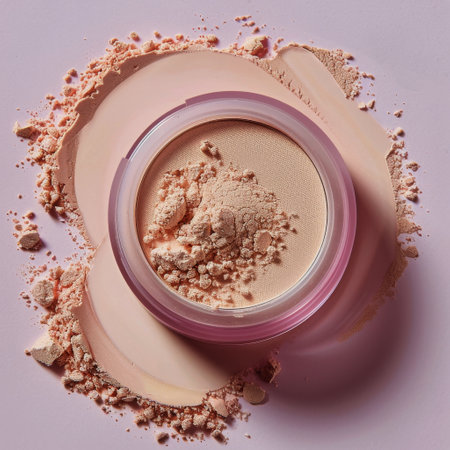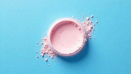 A beautifully styled open compact of soft pink makeup powder sits among scattered powder on a matching pink background, highlighting beauty and elegance.