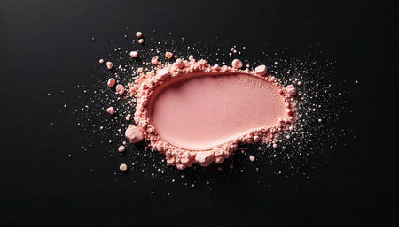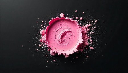 A close-up view of a pink blush compact with crushed powder scattered around on a dark surface, highlighting the artistry of makeup and beauty arrangements for creative visuals.