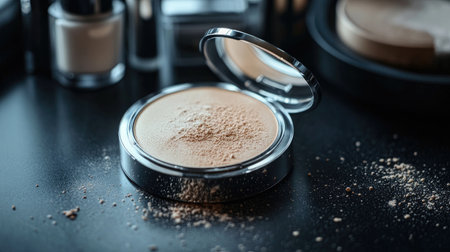 A stylish close-up of a powder puff and compact powder on a modern, sleek makeup table, with subtle lighting that highlights the texture and quality of the products.