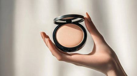 Elegant female hand with manicured nails holding cushion foundation compact, highlighting premium packaging and cosmetic detail