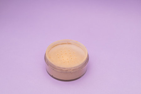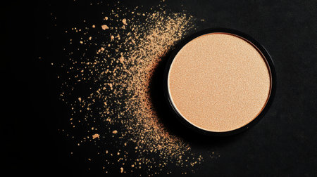 This image features a round container of makeup powder lying on a textured black surface, showcasing a soft, natural color. Perfect for beauty and cosmetic-themed projects.