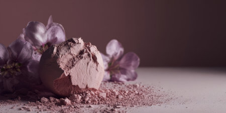 Face powder. Broken pieces of cosmetic powder with a pelargonium flower. Cosmetic smear. Make up a crushed powder.