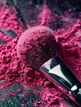 Capturing the dynamic moment of powder dispersing from a beauty brush, this image highlights the elegance and precision of cosmetic application in a visually striking manner.