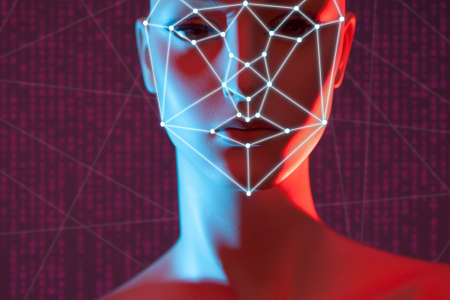 The face of a mannequin with control points. Facial recognition system. Biometric identification. The use of biometric information. Simplification of identification of a person.
