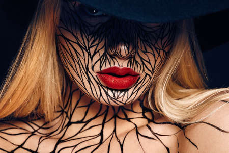 Close-up portrait of a woman painted with ultraviolet paints. The concept of Halloween.