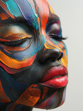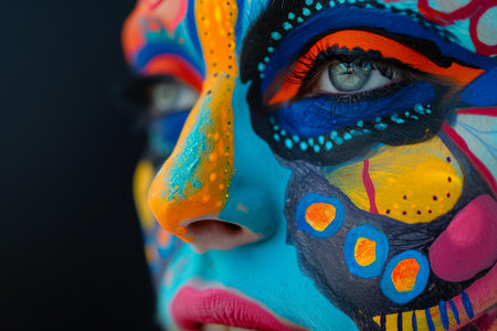 A close up view of a model with colorful face paint blending artistic design and beauty.