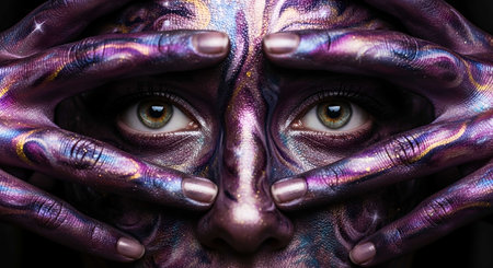 Portrait of a woman with glittery purple makeup on her face and hair, conveying a vibrant and artistic expression