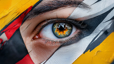 Intense close-up of a human eye with captivating hazel iris, surrounded by vibrant yellow, red, white, and black abstract face paint, creating a dramatic and artistic visual statement.
