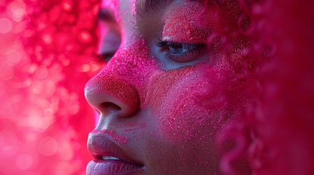 Close Up of Womans Face Covered in Pink Powder During Celebration