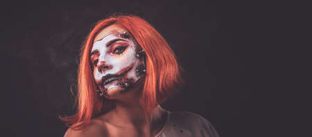 Portrait of ginger girl in role of creepy doll on Halloween.