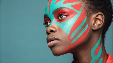 An artistic portrait of a young person showcasing eyecatching face paint in bright turquoise and fiery red. The abstract shapes along the sides of their face enhance their unique.
