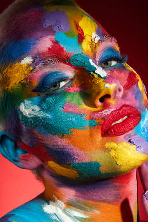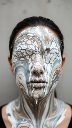 Woman with acrylic pour paint on her face and neck for artistic display. Abstract art and expressive design for concept of identity problem.