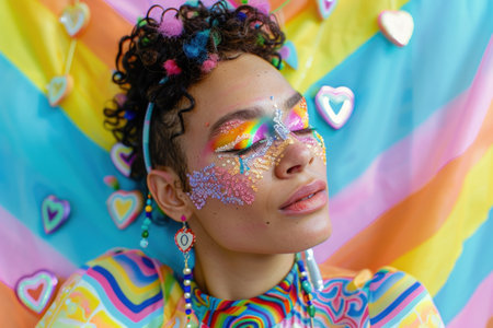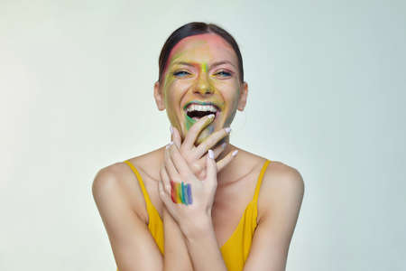 portrait of an attractive girl with bright makeup. A rainbow LGBT flag is depicted on her cheek