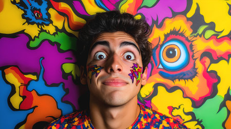 Young man with vibrant face paint smiling in front of a colorful psychedelic mural, radiating energy and creativity in a bold, artistic setting.
