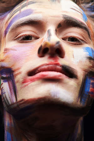 Close-up portrait of a handsome blond man with colorful painted face. Studio shot. Art, fashion and body painting.