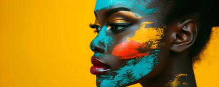A woman's face is painted in a colorful abstract style. The painting is a mix of blue, yellow, and red colors. The woman's eyes are closed, and her lips are painted red. The painting has a vibran