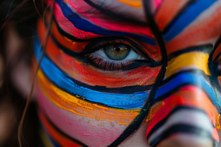 A person showcases intricate, colorful face paint with bold stripes during a lively artistic festival, capturing attention with their unique design and vibrant colors.
