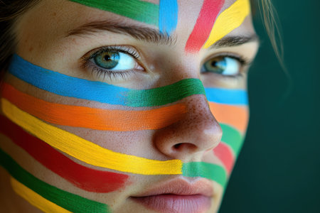 A model gazes confidently while displaying intricate lines of colorful face paint. Stripes of blue, green, yellow, orange, and red create a striking artistic look, emphasizing creativity.