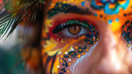 A close-up shot capturing the rich detail and colors of carnival-style eye makeup