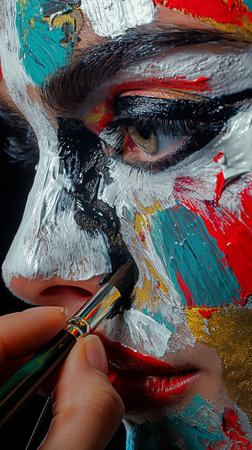 In a creative space, a model displays a striking face painted with bold geometric shapes and vibrant colors. The artwork captures attention, revealing a blend of artistic expression and beauty.