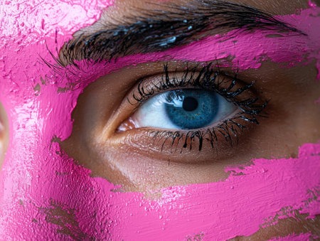 Close-up of a woman's face covered in pink paint, showcasing vibrant makeup and striking blue eyes.