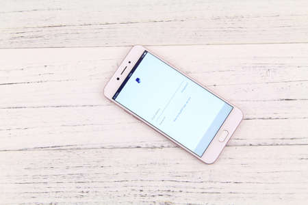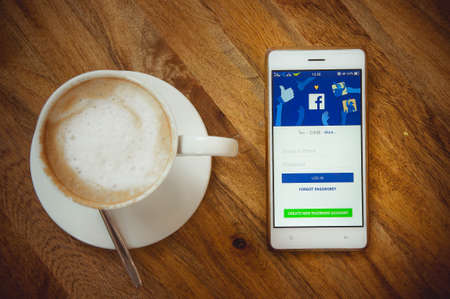 Udon Thani , Thailand - May 31, 2017 Smartphone and The login screen is showing application facebook is the social media connection people online and relax time hot drink coffee cup on wood table in coffee shop