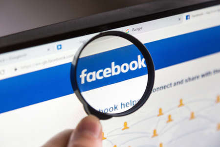 Ufa, Russia. February 15, 2019: A hand with a magnifying glass hoisted on the official Facebook website