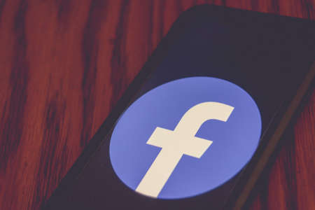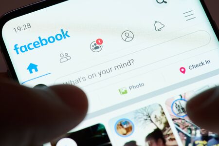 New york, USA - december 17, 2019: Using facebook app on smartphone screen close up view