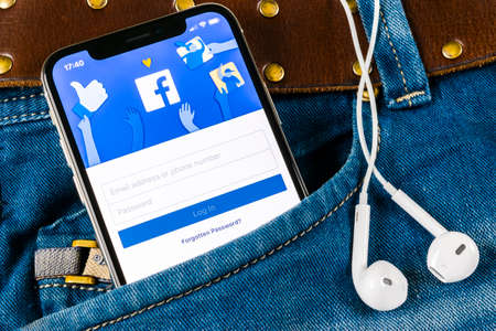 Sankt-Petersburg, Russia, April 14, 2018: Facebook application icon on Apple iPhone X smartphone screen close-up in jeans pocket. Facebook app icon. Social media icon. Social network