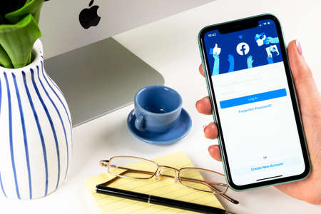 CHIANG MAI ,THAILAND - JULY 3, 2020 : Woman hand holding iPhone X to use facebook with new login screen.Facebook is a largest social network and most popular social networking site in the world