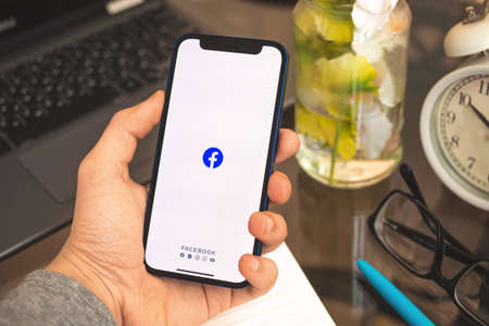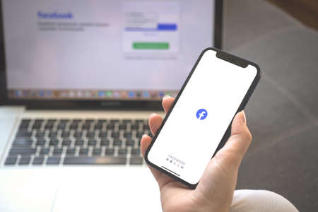 CHIANG MAI ,THAILAND APR 12 2021 : Woman holding a iPhone X with social Internet service Facebook on the screen.