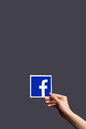 Kharkiv, Ukraine - June 05, 2020: Facebook logo. Social media. Global communication. Female influencer hand holding fb app icon isolated on dark purple empty space background.
