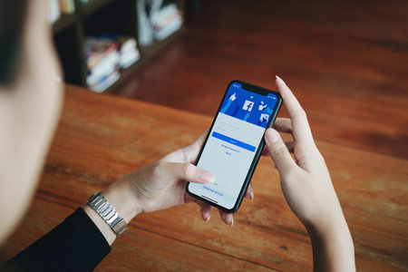 CHIANG MAI, THAILAND - FEB 28, 2022 : Facebook social media app logo from Meta on mobile app screen on iPhone 13 in persons hand working on e-commerce shopping business.