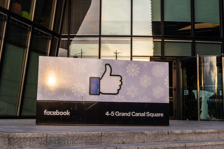 Dublin, Ireland - January 1, 2020: Logo of Facebook headquarters with a sunbeam, office building in Grand Canal Square, Dublin, Ireland