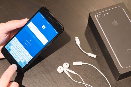 BANGKOK, THAILAND - NOVEMBER 24, 2016: Iphone7 Plus jet black serie with facebook application sign in screen and ear phone and jack converter