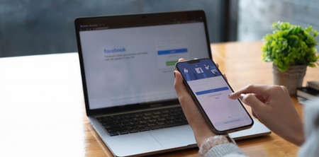CHIANG MAI ,THAILAND APR 12 2021 : Woman holding a iPhone X with social Internet service Facebook on the screen.