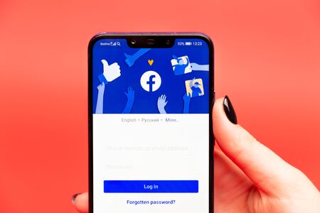 Saint-Petersburg / Russian Federation - 7 March 2019: Female hand holding cellphone with starting page of Facebook in russian version