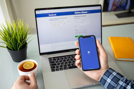 PETCHABURI, THAILAND-MAY 13, 2019: Facebook social media app icon signup page on iphone XR mobile smartphone device and computer laptop for user FB live public communication network.