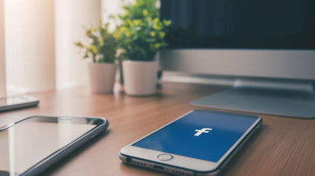 facebook page on the cellphone screen on the modern table. blank space on left