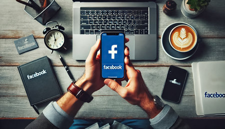 The images show a person using a smartphone displaying the Facebook app from various perspectives, including side, overhead, and close-up angles. A laptop and coffee cup are visible on the desk, alongside other items like a plant and glasses. The person is wearing a watch, emphasizing a professional setting.